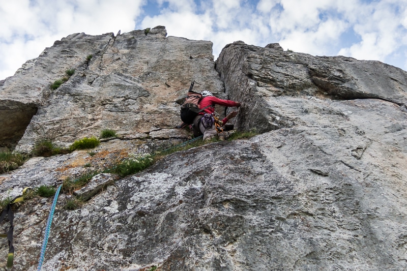 Traverser versant La Chapelle le deuxième gendarme et remonter sur l’arête par une petite brèche (goujon au sommet). Suivre la traversée herbeuse mais agréable qui vient buter contre une paroi verticale. Relais 4.