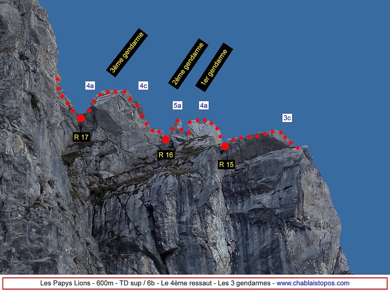 Gravir tout droit l’arête jusqu’au sommet du premier gendarme (4a). Traverser pour gagner l’arête du second gendarme, la surmonter et se protéger avec un goujon, invisible du bas, placé sur son sommet pour redescendre l’arête opposée jusqu’à une profonde brèche (5a). Relais 16